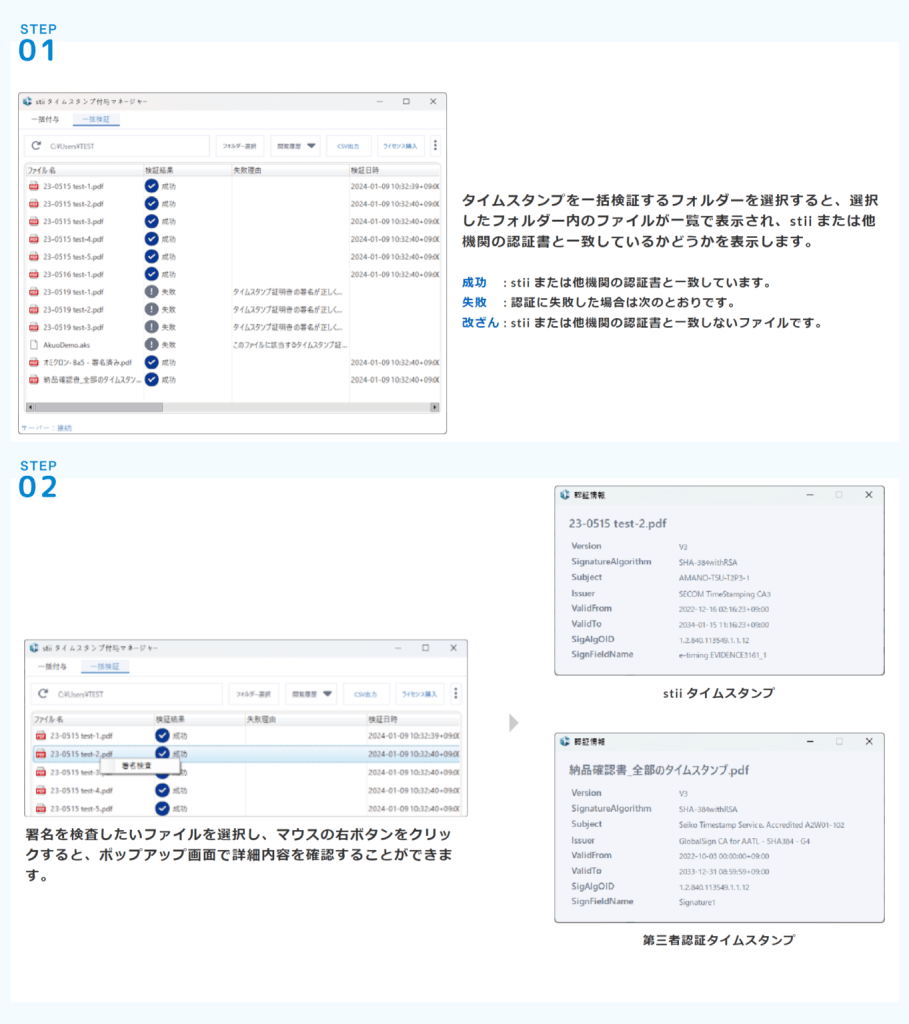 タイムスタンプ一括検証/タイムスタンプの情報確認/csvエクスポート機能